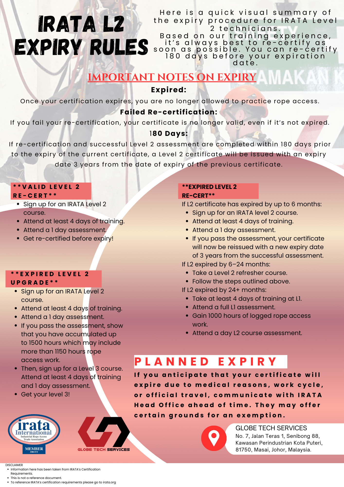 Technicians who have allowed their Level 2 certification to expire by between 1 day and 6 months should arrange for re-certification L2 training with an IRATA training member company such as Globetech Services Sdn Bhd.